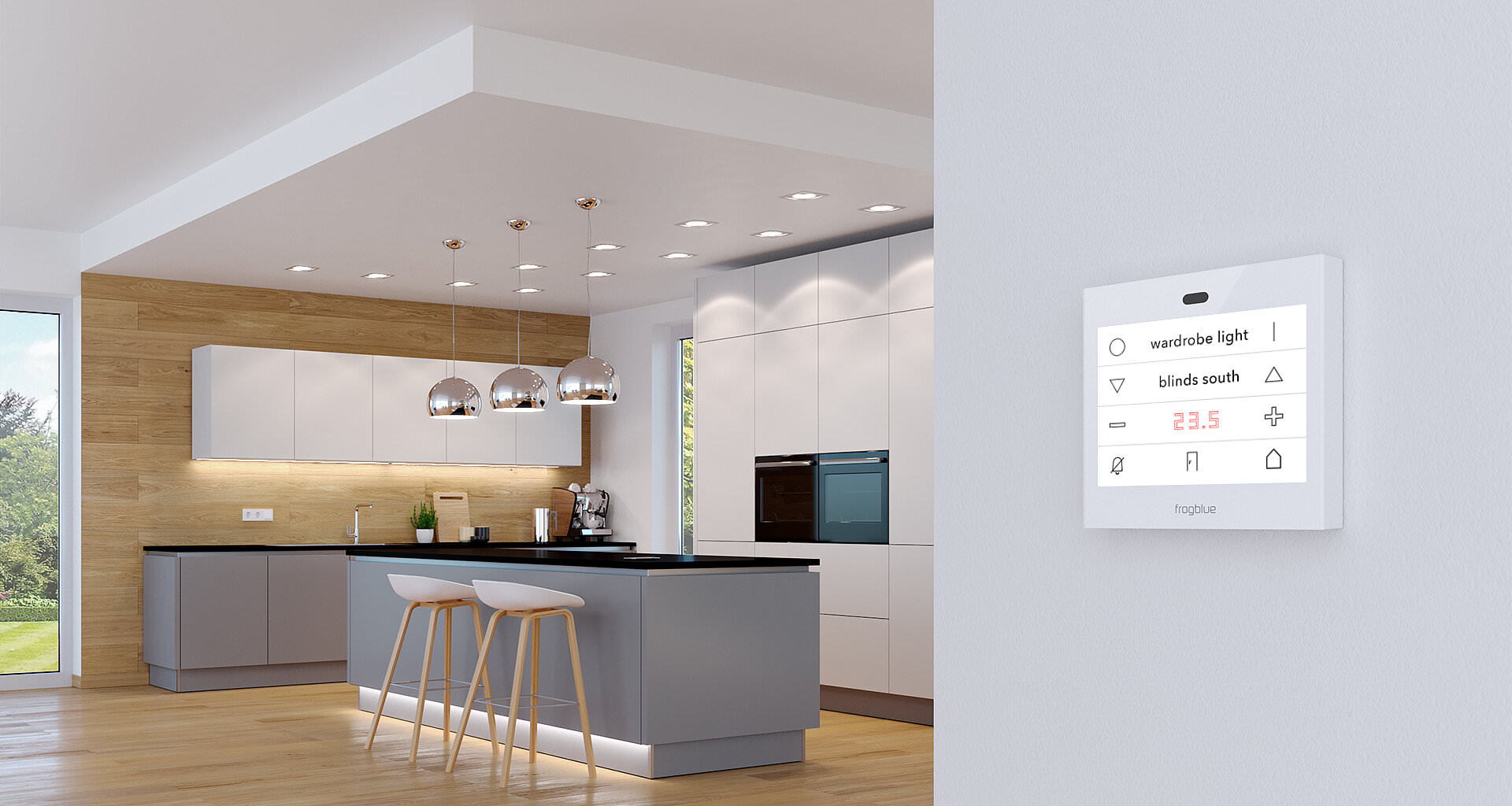 The frogblue system can be controlled in a variety of ways. Either with the usual light switch, the frogControl app for Smartphone and Tablet as well as for the frogDisplay or with our transponder, the frogKey. The communication of the end devices with our frogs is done via the frogblue-mesh-network via Bluetooth®.