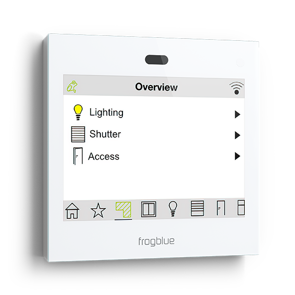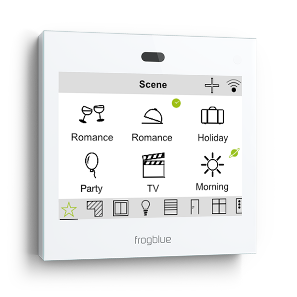 With the frogDisplay any and all functions and scenarios of intelligent living can be controlled. It expands the frogblue system by visualization, access control, intercom, alarm system and video as well as camera display. A secure remote access is possible via its WiFi connection.