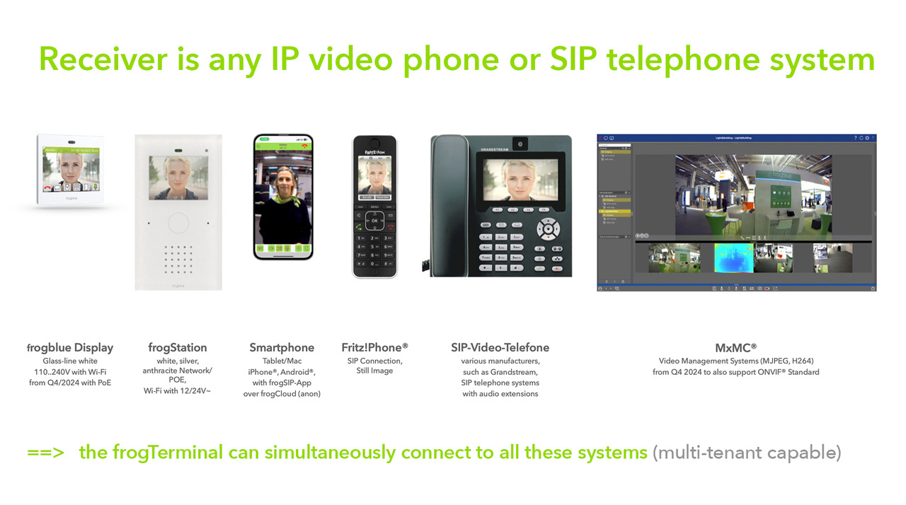 ==> The frogTerminal can dial into all of these systems simultaneously; also into several SIP servers
