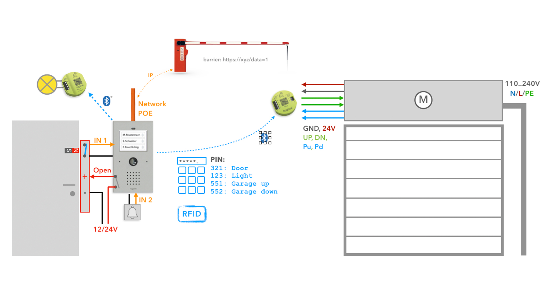 These actions can be triggered via PIN and RFID card as well as via the telephone connection. For example, barrier controls can be addressed via IP or status data from roller shutters can be queried.
