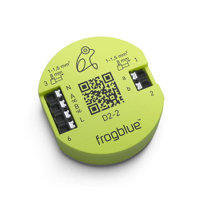 All these functions are controlled by a frogblue module, which we refer to as a “frog”. These frogs switch or dim lights in colour and brightness, register the actuation of light buttons, secure and open doors, position blinds and activate fans centrally or time-controlled. Our frogs are installed in a flush-mounted box directly behind the light button or load and only have to be connected to the 230V mains. Control functions are interchanged via a wireless Bluetooth® network, so that control cables or a central control cabinet are not required. This saves you at least half the cables and expensive energy for a cabinet.