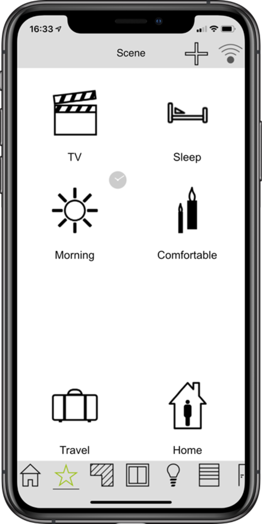 With just one click all lamps and blinds adjust for the TV evening. When leaving the apartment, one commando moves the blinds down, lowers the heating, turns off the lighting and activates the alarm. It can be controlled via Display, Smartphone, or just a double-click on the light switch. If there should be any window or outside door still open, it will be shown.