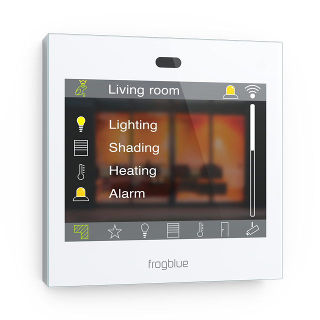 The frogblue Display monitors the building. Wireless. Every door, every window, every light switch or every motion detector can set off an alarm. Filtered by time or just in certain rooms. A telephone call with voicemail signals the alarm and reaches places, where internet does not work anymore due to bad connection. Remote control and two-way intercom are possible via telephone as well.