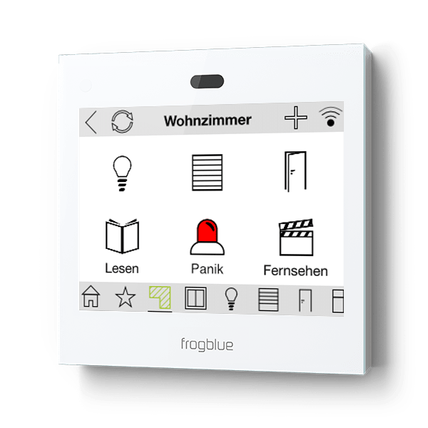 Neben eigens konfigurierbaren Szenen wie bspw. “Panik” in der frogControl App oder im frogDisplay kann jeder beliebige Taster/Schalter eine Panikfunktion auslösen. So können zum Beispiel alle Jalousien im Gebäude nach oben fahren, die Beleuchtung angeschaltet werden und im Außenbereich blinken. Die Sirene wird aktiviert und vordefinierte Rufnummern angerufen.