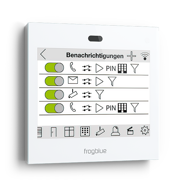 Neben der Funktion als Touchscreen Bedieninterface für das Smart Home kann das frogDisplay auch als Alarmanlage genutzt werden. Werden Fenster und Türen geöffnet, ein Lichtschalter zur falschen Zeit gedrückt oder eine externe Sensorik wie bspw. Bewegungsmelder meldet ein Signal, sendet das Display einen Alarm per Telefonanruf, E-Mail oder Kameraanzeige.