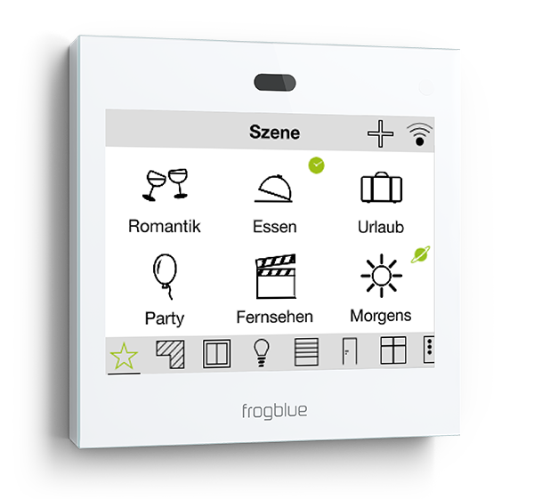 Mit dem frogblue System können alle Jalousien auf individuelle Positionen gefahren und die Lamellen eingestellt werden. Im Vergleich zu einer herkömmlichen Installation kann von jedem Schalter/Taster bspw. ein Zentralbefehl für eine gebäudeweite Steuerung der Jalousien erfolgen. Der Austausch der Schaltbefehle erfolgt drahtlos über “virtuelle Kabel” via Bluetooth®.