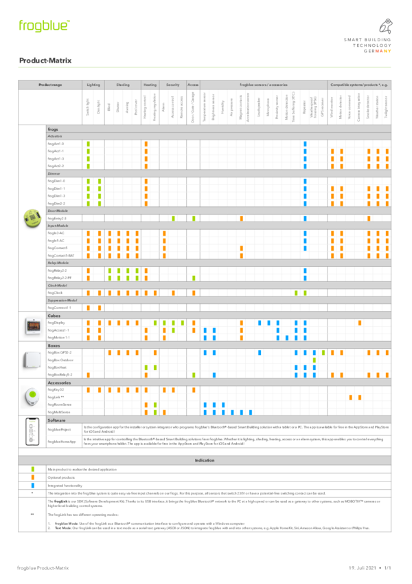 – Text Mode: Use as serial text gateway (ASCII or JSON) for frogblue integration from and into other systems